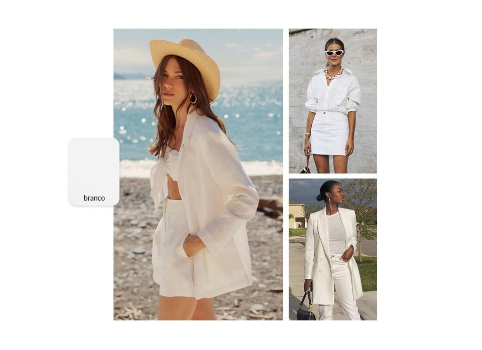 Bom, vamos começar por uma cor que todo mundo tem no armário: o branco! Se você deseja transmitir frescor e leveza, essa é a escolha certa. Além de exaltar outras tonalidades e criar contraste com a maioria dos elementos, ela também associa a paz, inocência e clareza. Mas aqui vai um aviso: cores claras, como o branco, costumam ampliar a silhueta de algumas partes do nosso corpo, ou seja, se você tem muito quadril e não quer realçá-lo, a dica é evitar usar peças brancas nessa área.